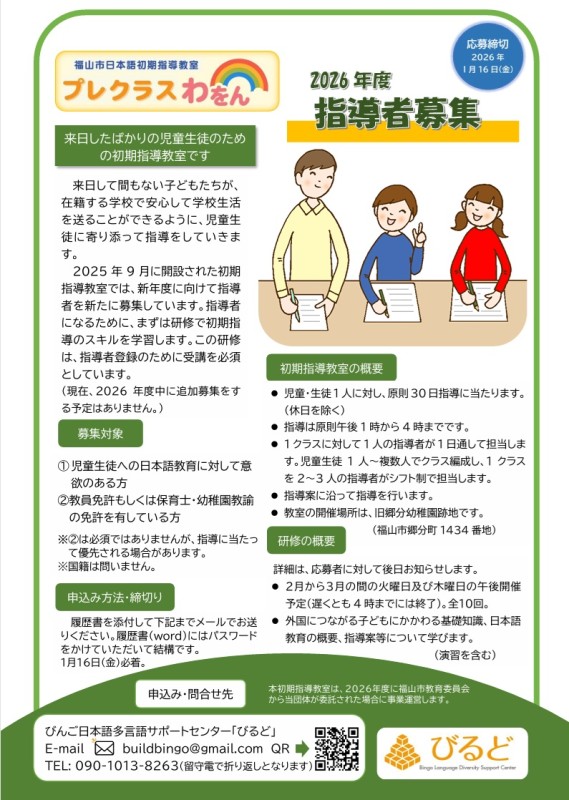 Na cidade de Fukuyama, há uma sala de aula de orientação inicial para alunos que acabaram de chegar ao Japão. Estamos recrutando novos instrutores para o ano letivo de 2026. Para se registrar como instrutor, é uma das condições aprender sobre orientação inicial em um treinamento.